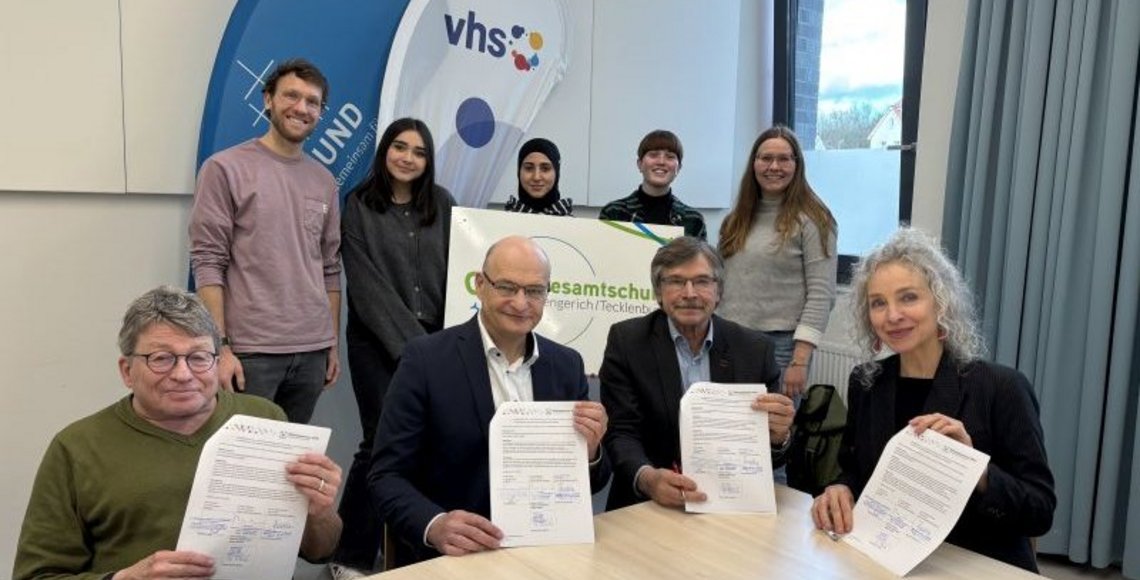 Lengerich. Was bereits seit Jahren in der Praxis gelebt wird, ist nun auch offiziell: Die Gesamtschule Lengerich/Tecklenburg, die Volkshochschule Lengerich und der Volksbund Deutsche Kriegsgräberfürsorge haben im Januar 2025 eine Bildungspartnerschaft unterzeichnet. Die Schirmherrschaft übernahm Bürgermeister Wilhelm Möhrke.