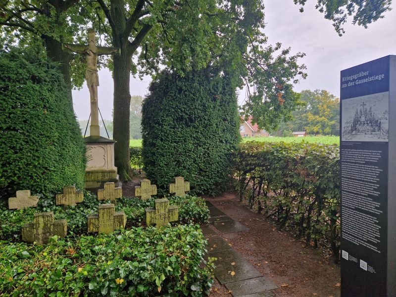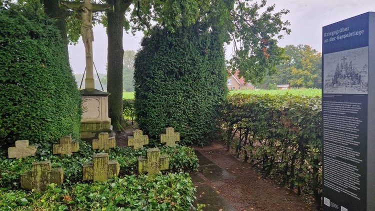 Hinweis des Volksbundes: Anlässlich des Projektes „Ge(h)denken! Monat des Kriegsgrabes“ hatte es im September 2024 bereits die Einweihung eines Erinnerungszeichens auf der Kriegsgräberstätte an der Gasselstiege gegeben (siehe Foto von Jens Effkemann). Auf der sehr kleinen Kriegsgräberstätte sind zehn z.T. sehr junge, vermutlich schlecht ausgebildete, Soldaten bestattet, die am Ostersonntag, 2. April 1945 bei den militärisch aussichtslosen Verteidigungskämpfen gegen die britische Armee ums Leben kamen.