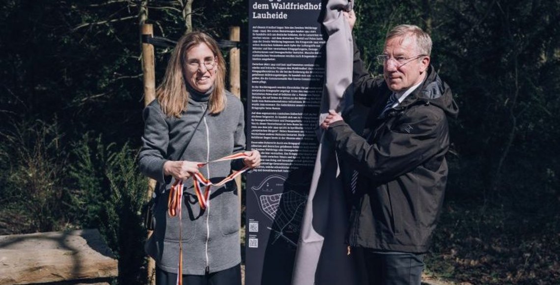 „Genau 80 Jahre nach Ende des Zweiten Weltkriegs hat die Stadt Münster am Mittwoch, 2. April, bei einer öffentlichen Gedenkveranstaltung auf dem Waldfriedhof Lauheide an das Ende der nationalsozialistischen Gewaltherrschaft erinnert. Stadträtin Cornelia Wilkens und Stadtrat Wolfgang Heuer gedachten der Verstorbenen des Zweiten Weltkriegs. Zudem weihten sie drei neue Info-Stelen auf dem Waldfriedhof ein. Diese erläutern Hintergründe und bieten Informationen zur Geschichte der Kriegsgräber.